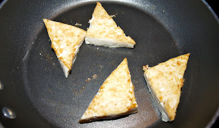 - Drain the tofu and cut it into small triangles. Thin, small slices work best for the dry frying method you will be using. In order to dry fry the tofu, you need a pan that the tofu won’t stick to without using any oil. You can use either a well-seasoned cast-iron skillet or a non-stick skillet. I don’t have a big enough non-stick skillet, so I had to do mine in batches. I also used a separate pan for Meghan’s.