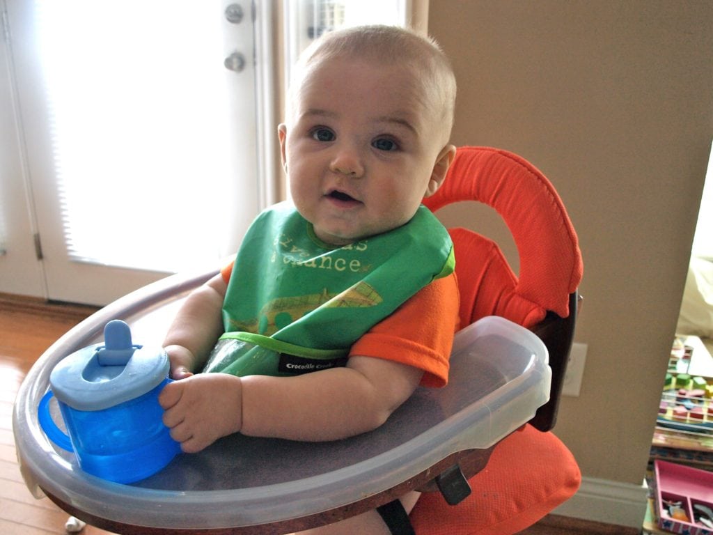 We also give him water with his solids to help prevent constipation. He’s doing well with the sippy cup. I haven’t been able to find a non-plastic age-appropriate sippy cup yet, so I had to settle for a BPA-free plastic one. I’ll let you know if I find something that is non-plastic that works.