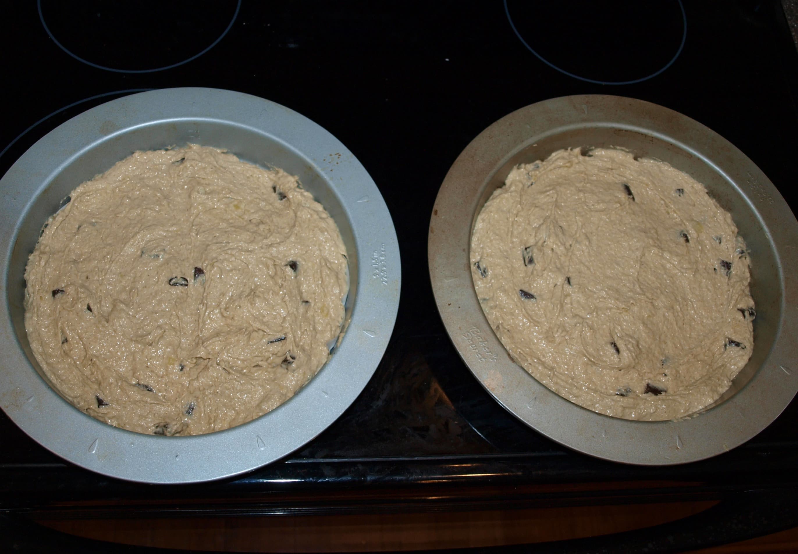 - Transfer 1/2 the mixture to one prepared cake pan and the other half to the other. Bake in the preheated oven for 20-30 minutes, or until an inserted toothpick comes out clean.