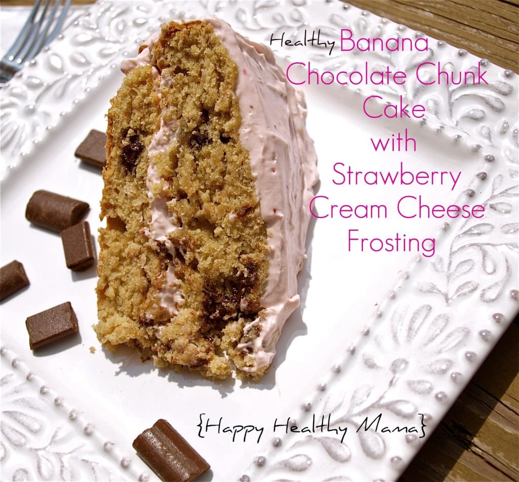 I think this cake would be great with chocolate frosting, but I wanted to use strawberry because a pink cake matches the theme of her birthday party better. Priorities, right? It works nicely–like a banana split!