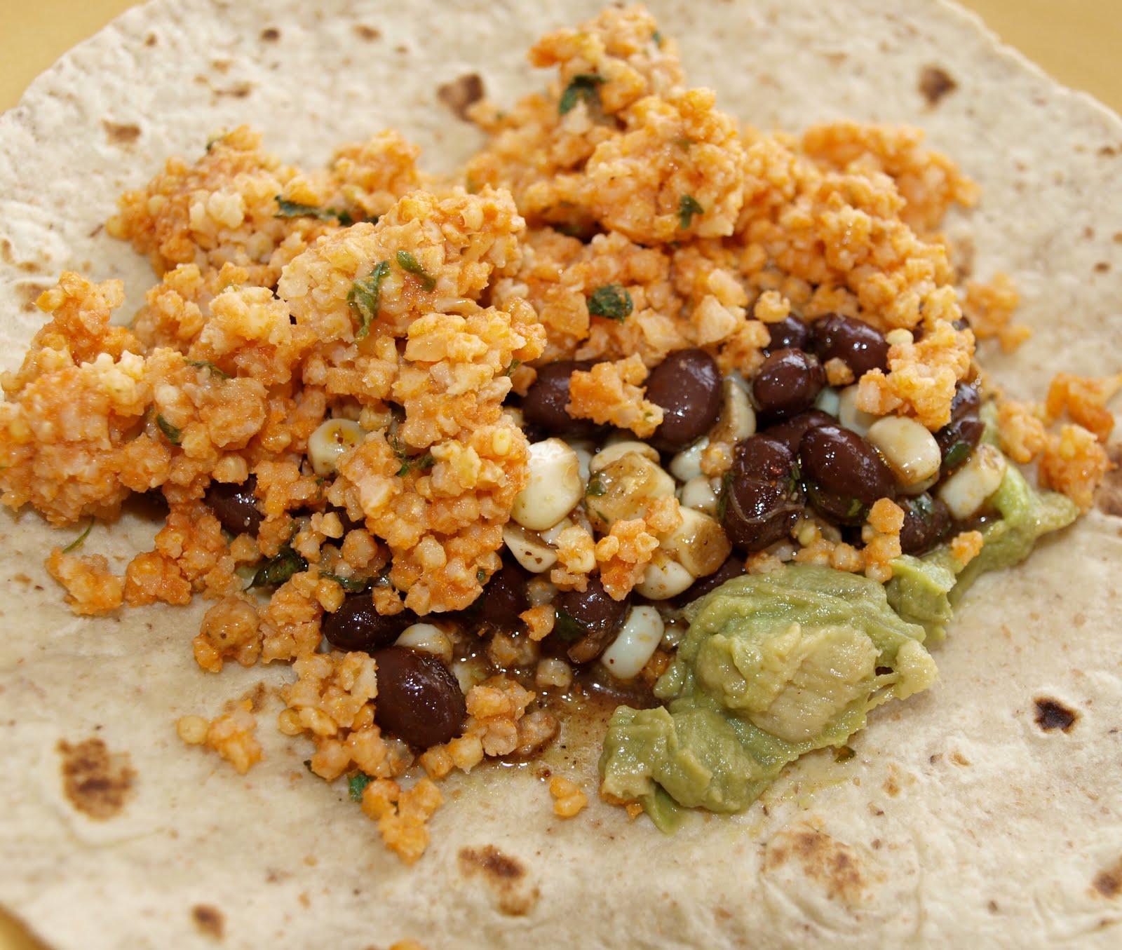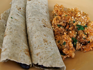 After deciding on the Mexican Millet from Veganomicon, I continued my menu planning. There’s a bean and corn salad that I often make. The original recipe is from allrecipes.com , but it uses canned corn. It’s a shame to use canned corn when the fresh corn is ripe for the pickin’! So I decided to switch it up a bit and use fresh corn. Usually we use this recipe as a dip for our tortilla chips, but thought it would make a scrumptious filling for some whole wheat tortillas I had in the pantry.