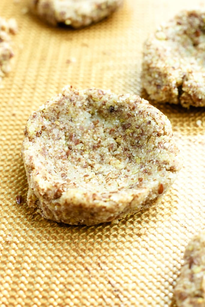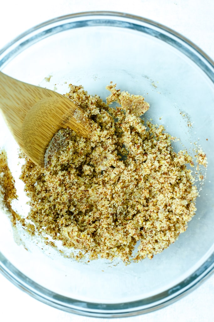- In a medium bowl, mix together the almond flour, ground flaxseed meal, melted vegan butter or coconut oil, and maple syrup until combined.