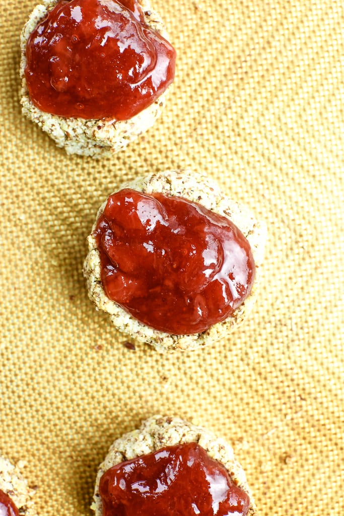 - Place 1 tablespoon of jam in the indentation of each cooled cookie. Place in the freezer and freeze for at least 30 minutes.