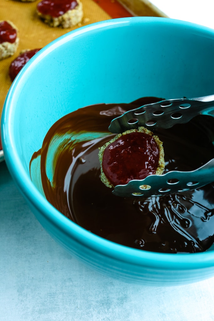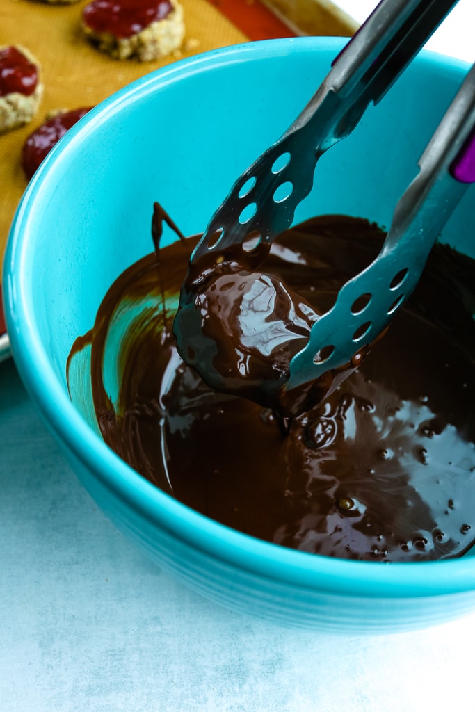 7. Use tongs to pick up the cookies and dip them into the chocolate one at a time. Repeat until they are all coated in chocolate.