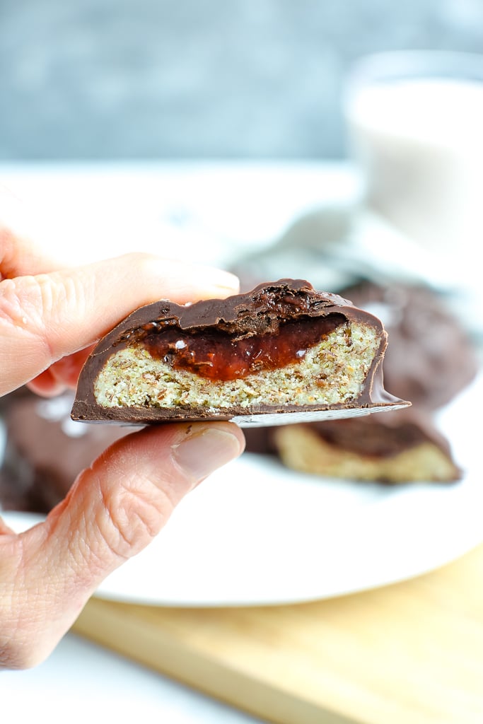 Vegan and gluten-free, these simple cookies made with almond flour, flaxseed meal, and maple syrup, paired with strawberry jam and chocolate, make a delicious, healthy treat!