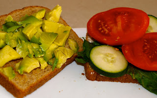My favorite sandwich in the whole world is one that includes avocado. I found the recipe for this sandwich years ago in a book called Food for Life. It includes 1/2 an avocado, a few slices of a tomato, 3-4 slices of cucumber, a little romaine lettuce, and some vegan mayo on toasted whole wheat bread. So good.