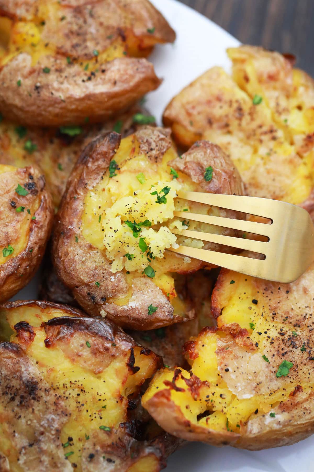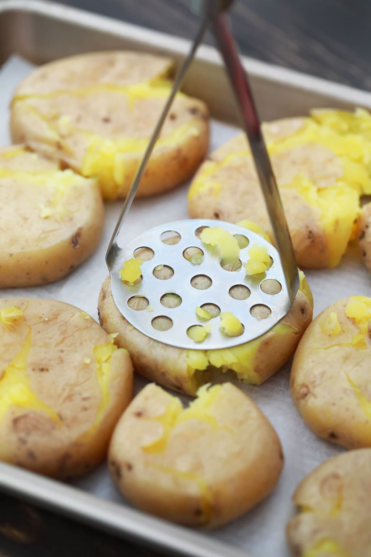 I recommend using a potato masher to smash potatoes. You can also use a fork, the bottom of a glass, or even a paper towel as a cover if you want to smash them with your hands. Smashing the potatoes increases the surface area allowing them to become super crispy!
