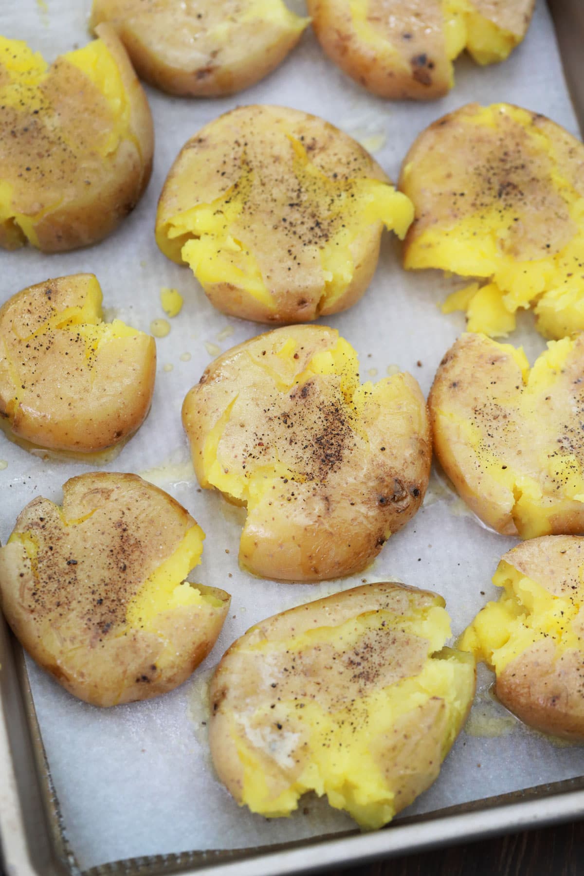 I recommend using medium or small potatoes. You could also use baby potatoes. Larger potatoes will work, but will be harder to smash and you’ll need to boil them longer. Smaller potatoes are able to get more flat when you smash them, which equals a crispier potato. Larger potatoes will still be crispy on the outside, but you’ll have a fluffy interior. Some people may prefer that, but we love the results from small or medium potatoes!