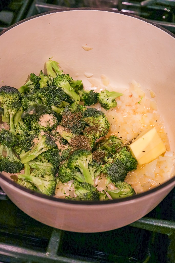 3. Next, you’ll need to add in the butter, orzo, broccoli florets, and thyme. Cook until it’s golden and the broccoli and orzo are toasted about 5 minutes.