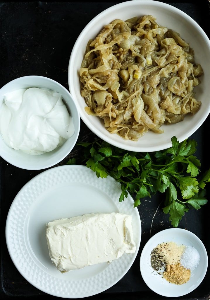 Note 2:Â If you don’t have a food processor, you may chop the parsley by hand and use a hand mixer or strong arm to combine the sour cream and cream cheese. Coarsely chop the onions before adding to the mixture.