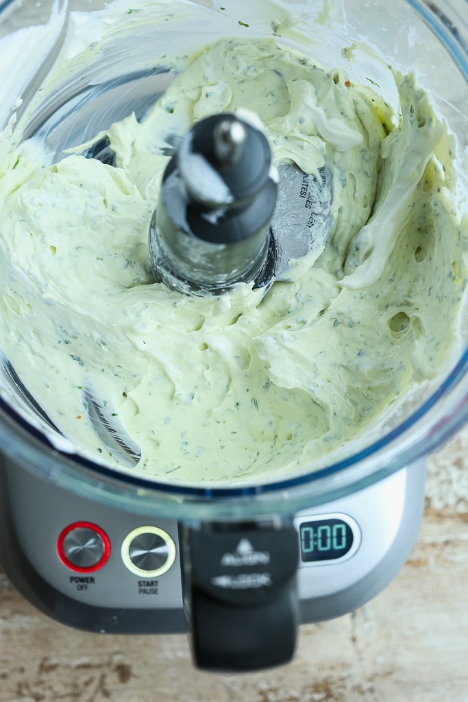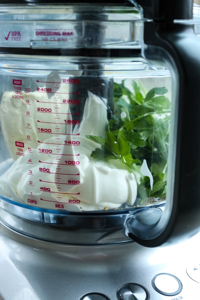 - Place the sour cream, softened cream cheese, parsley, salt, pepper, onion powder, and garlic powder in a food processor* (note 2) fitted with the s-blade. Process until you have a smooth, creamy mixture.