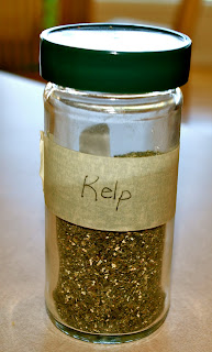 While she was eating her peas, I prepared her a classic grilled cheese sandwich, with a little sprinkle of kelp. Kelp, or seaweed, contains nearly 30 minerals so I sprinkle it on certain foods whenever I can. Just a healthy little add-on to boost the nutrition of a regular old grilled cheese. Here’s my kelp container: