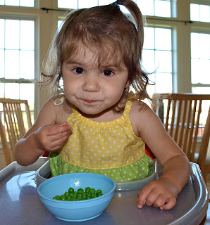 As I mentioned yesterday, we just got back from a two-week vacation. We are barely going to get unpacked before we will be back on the road again as we are heading to Chicago for the weekend. With such a short time between trips, I’m keeping lunches simple this week. Meghan started out with a bowl of organic peas with a some butter. (I used frozen so I just had to heat them up in the microwave for 30 seconds) She ate the entire bowl–she really likes peas. Here she is enjoying her first course: