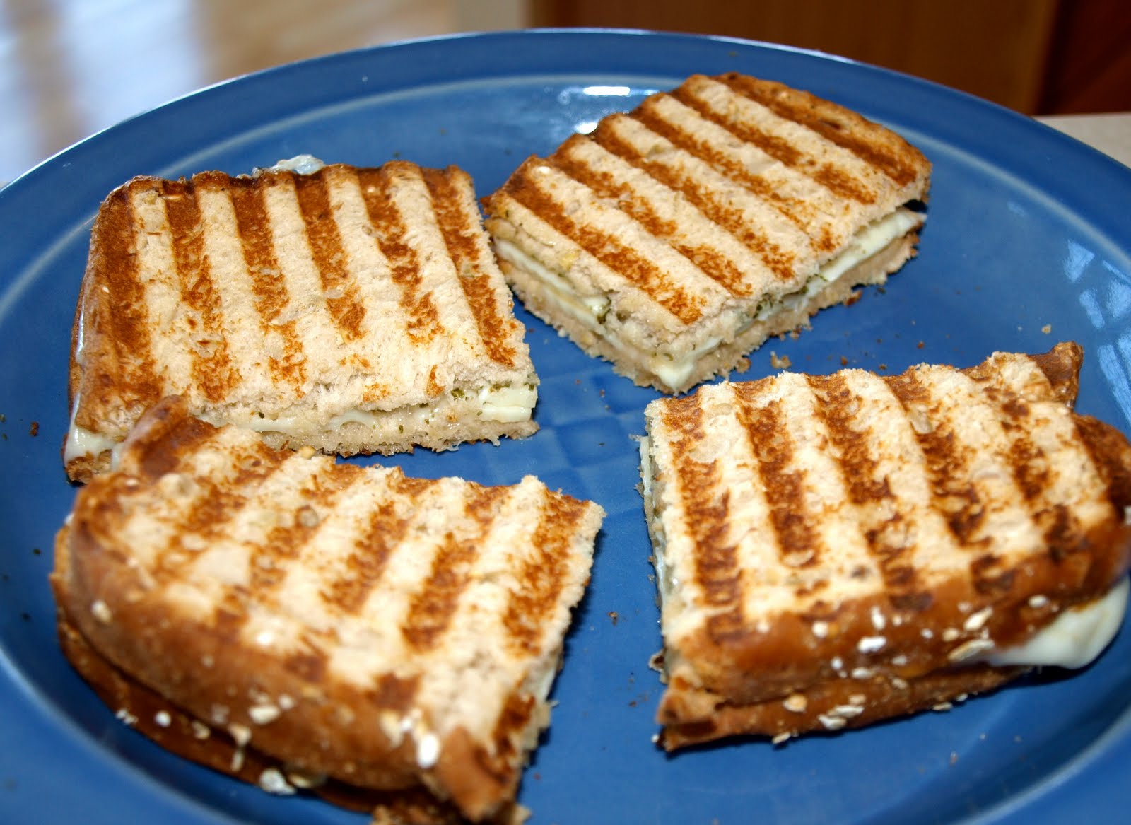 I bought an empty spice container with a sprinkle top and buy the kelp from the bulk section of the health food store. Here’s the sandwich before I put it in the panini press. (Using the panini press is so much easier than a pan!) The swiss cheese I used was so holy I needed to use two pieces.