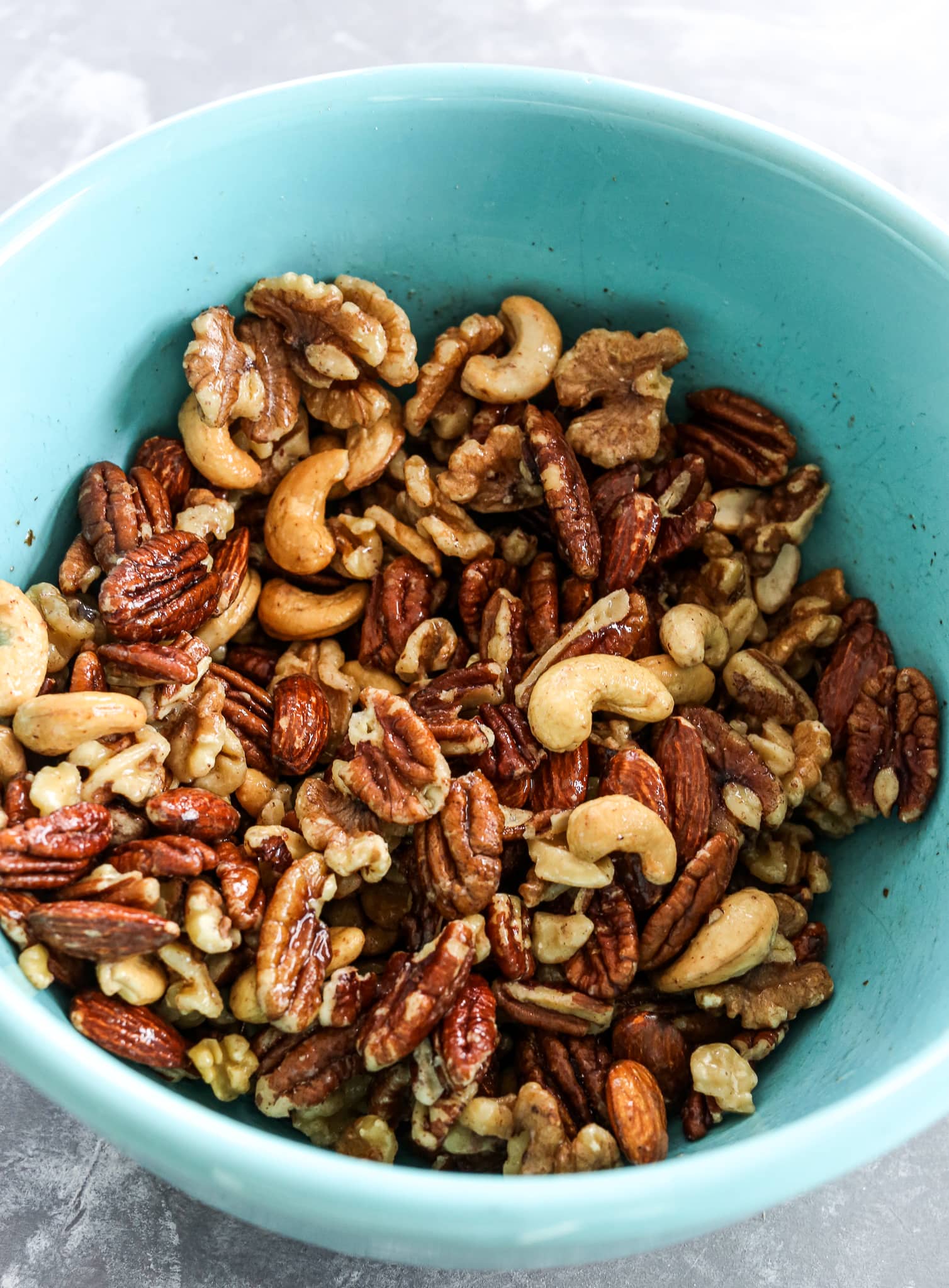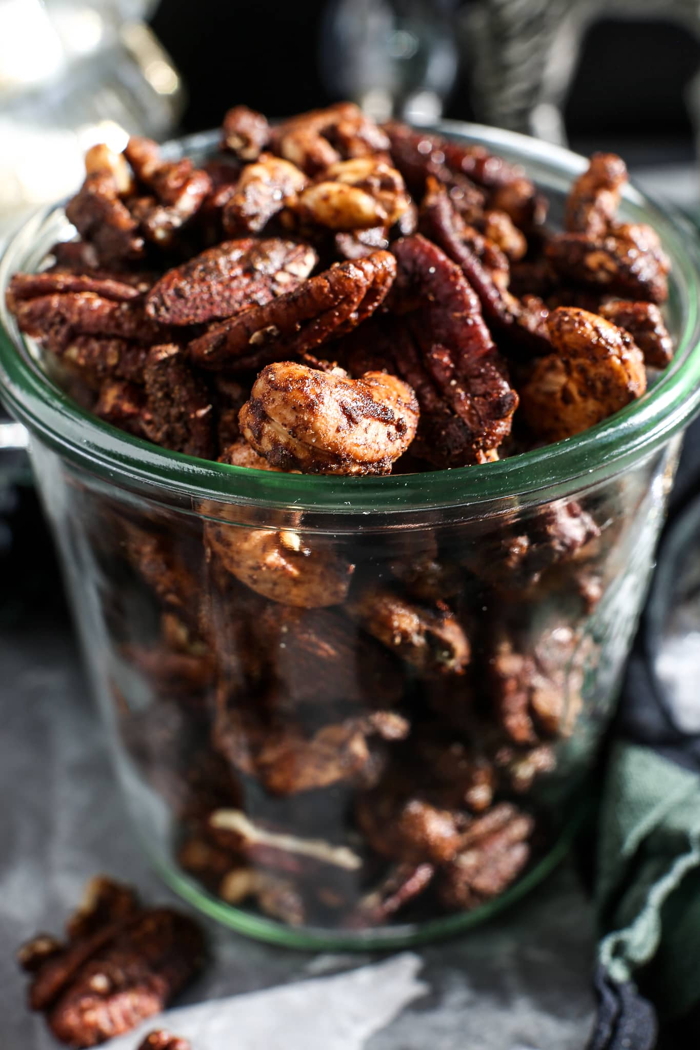 I like to store these nuts at room temperature in any airtight container like a mason jar. You could even keep them in a festive, nice jar and leave them out as a decoration if you’d like!