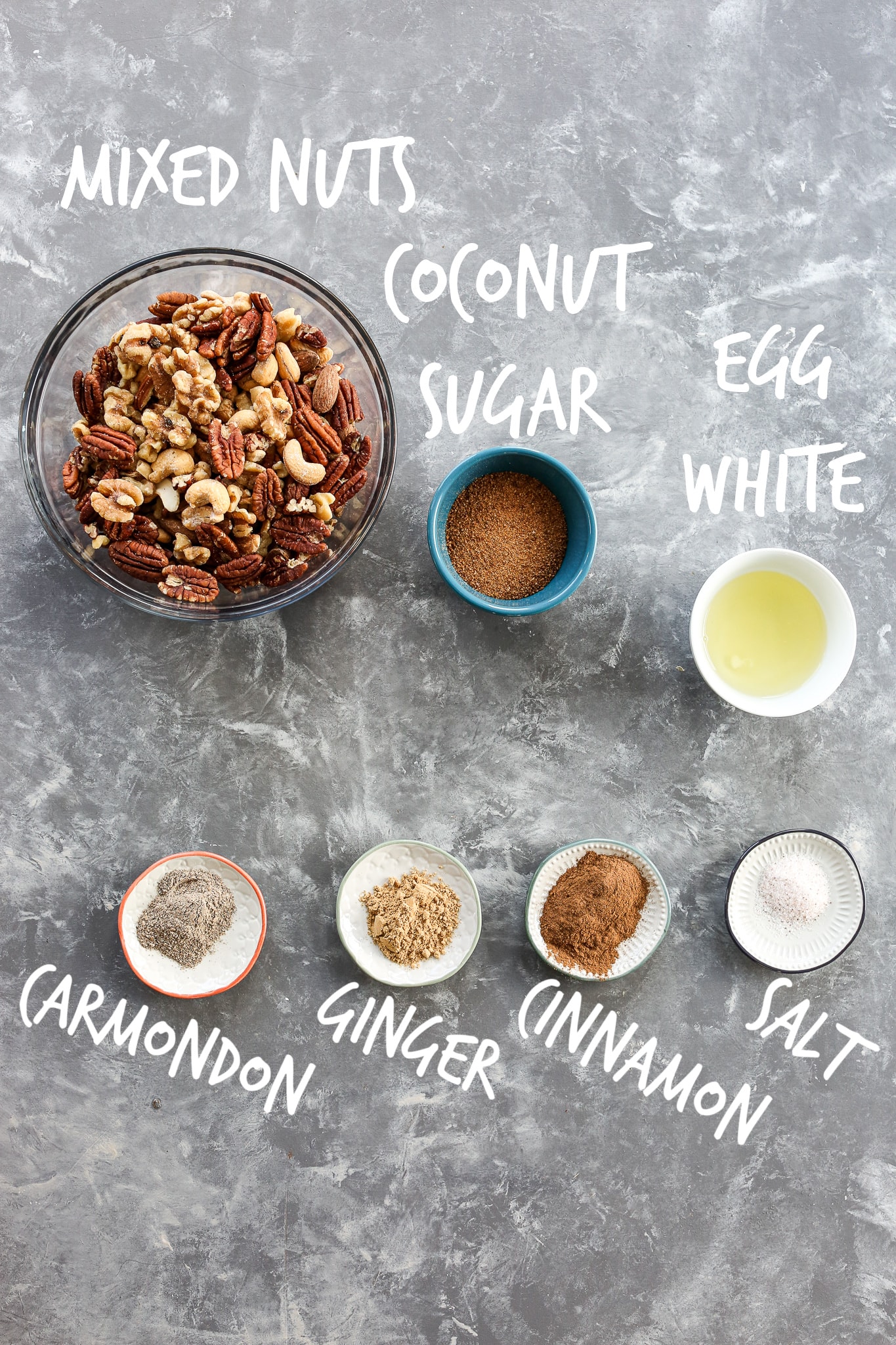 - In a large bowl, whisk together the egg white, water, and salt. Add the nuts and stir or toss to coat.