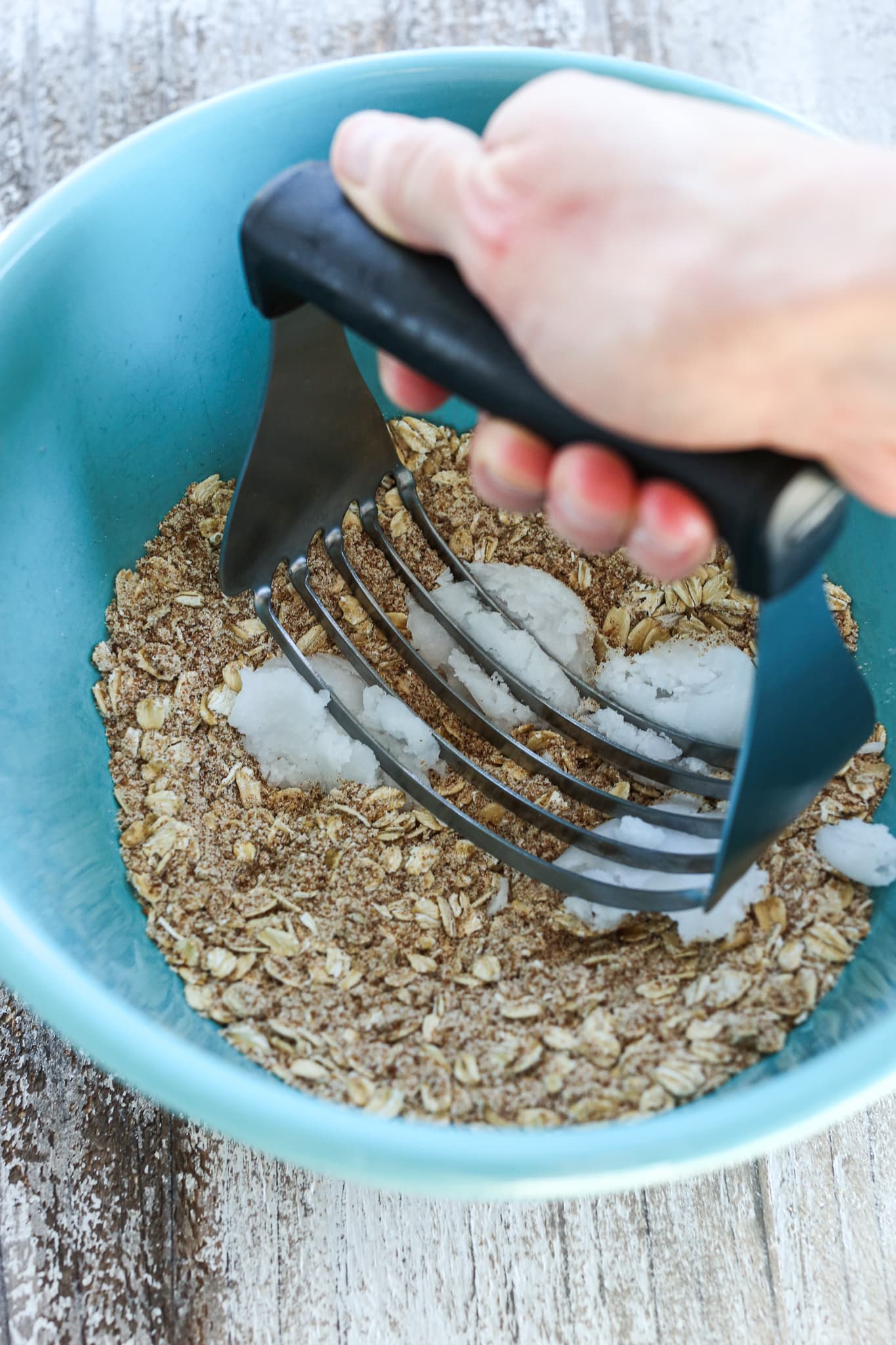 - Make the topping: In a large bowl, combine the all of the topping ingredients. Use a pastry cutter or your hands to combine the coconut oil or butter into the ingredients. You can also use a pastry blender if you have one. If you are using butter, make sure you use softened butter, not melted butter.