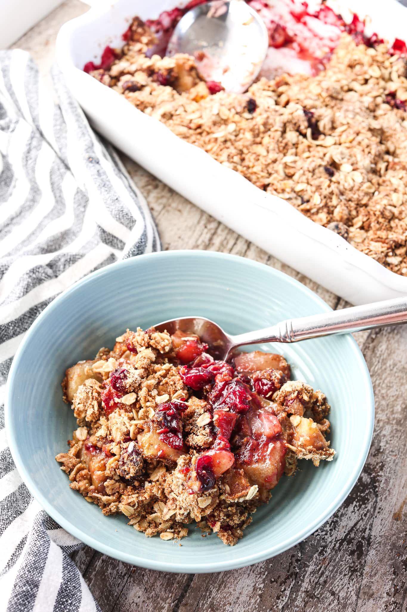 I love a good crisp. I have a recipe for Peach Berry Crisp and Healthy Apple Crisp, but I wanted to make a crisp that was great for this time of year. It’s such a feel-good dessert. Top it off with a scoop of vanilla ice cream, and you’ve got yourself a melt-in-your mouth bowl of heaven.