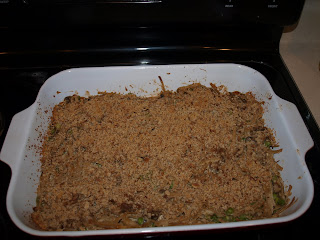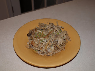 For dinner we had Cashew Fettuccine with peas and mushrooms. The sauce was intended to mimic a cream-based sauce and made with cashews, nutritional yeast, and soy milk. I loved it. It was mixed with whole wheat fettuccine, mushrooms, peas, topped with whole wheat breadcrumbs, and baked. This was a nice, hearty meal that we both liked a lot. There was plenty left over so we’ll have that for dinner tonight also.