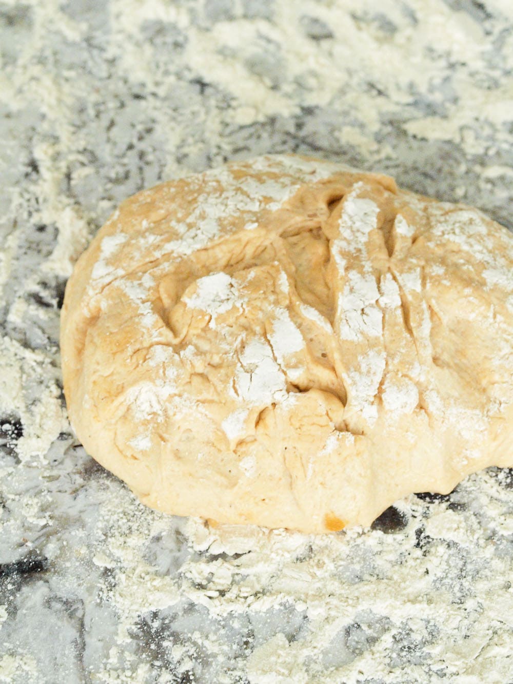 7. Now you are ready to shape your dough. I don’t do any flipping. This is my easy recipe, remember? I press the dough firmly with my fingers and/or knuckles so it spreads out evenly. Make sure your surface has plenty of flour and add more if necessary. You can also add more flour to the dough at this point if it needs it. Just sprinkle some on it and work it in. Keep pressing the dough out with your hands until it is a medium circle. You can also lift it gently and use the back of your knuckles to stretch it out. I like this dough on the thick side, but you can press/stretch it thinner if you prefer.