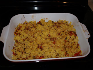 After cooking the vegetables and lentils, the entire melange is put into a baking dish and topped with the cooked millet*. Then you bake it in the oven at 350 degrees for about 30 minutes.
