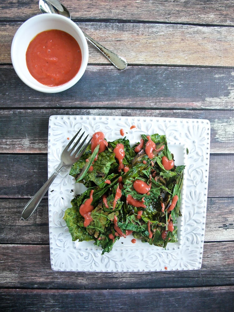 I made a smoky raspberry barbecue dressing to go with my grilled kale salad. The smoky flavor paired with the tart raspberries complimented the crispy kale perfectly. This dressing also works well as a dipping sauce if you choose to use your grilled kale as chips. I know you’ll love it, too!