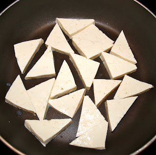 - Drain the tofu and cut it into small triangles. Thin, small slices work best for the dry frying method you will be using. In order to dry fry the tofu, you need a pan that the tofu won’t stick to without using any oil. You can use either a well-seasoned cast-iron skillet or a non-stick skillet. I don’t have a big enough non-stick skillet, so I had to do mine in batches. I also used a separate pan for Meghan’s.