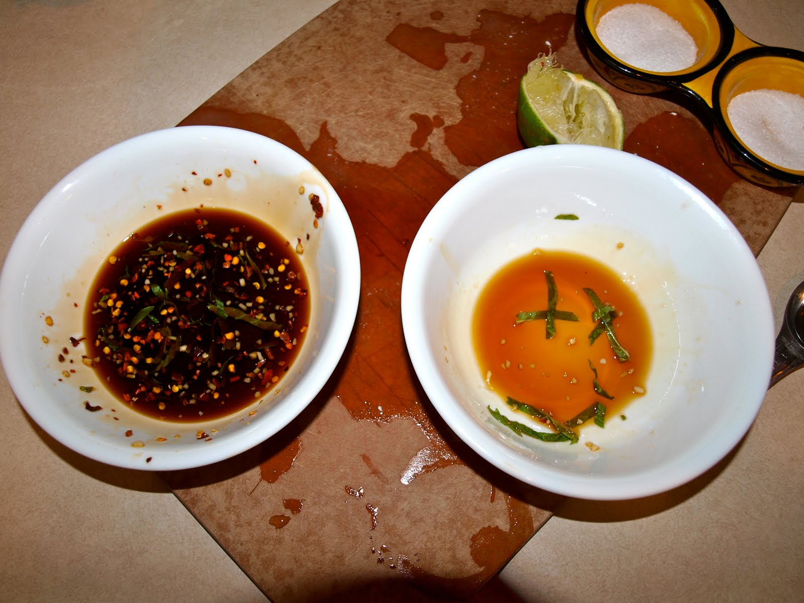 - Prepare the sweet chili lime sauce by whisking together all the sauce ingredients. I divided the ingredients and made a smaller, separate bowl of all the ingredients except the red chili flakes for Meghan.