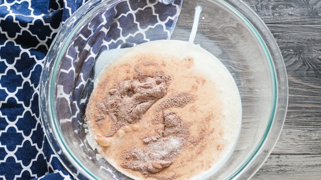 - Start by placing your one cup of heavy whipping cream, cocoa, swerve sweetener, and vanilla into a large mixing bowl.