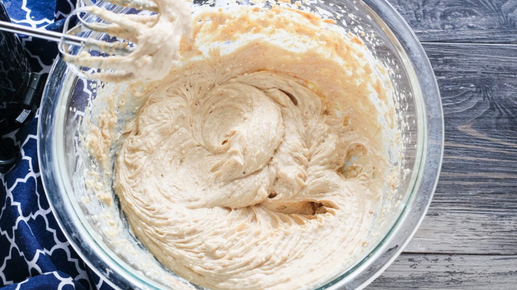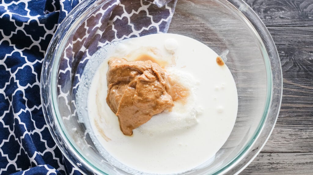 - Place you 3/4 cup of heavy whipping cream, cream cheese, natural peanut butter, swerve, and vanilla into a large mixing bowl.