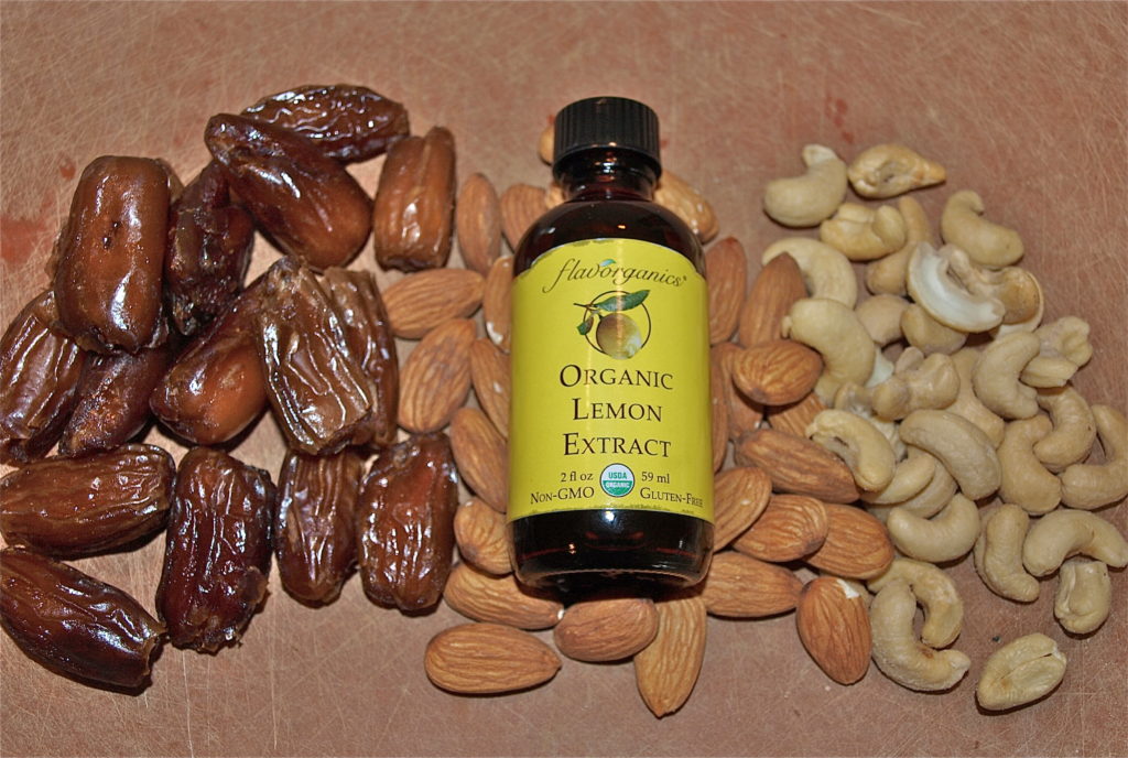 - Put the dates, cashews, and almonds in a food processor and process until the dates and nuts are broken down. Add the lemon extract and continue to process a little more. The mixture will look a little dry and like it’s not going to stick together, but it will, trust me!