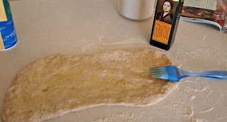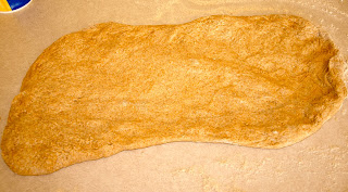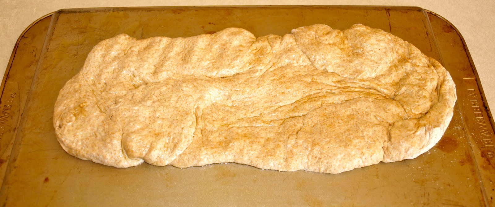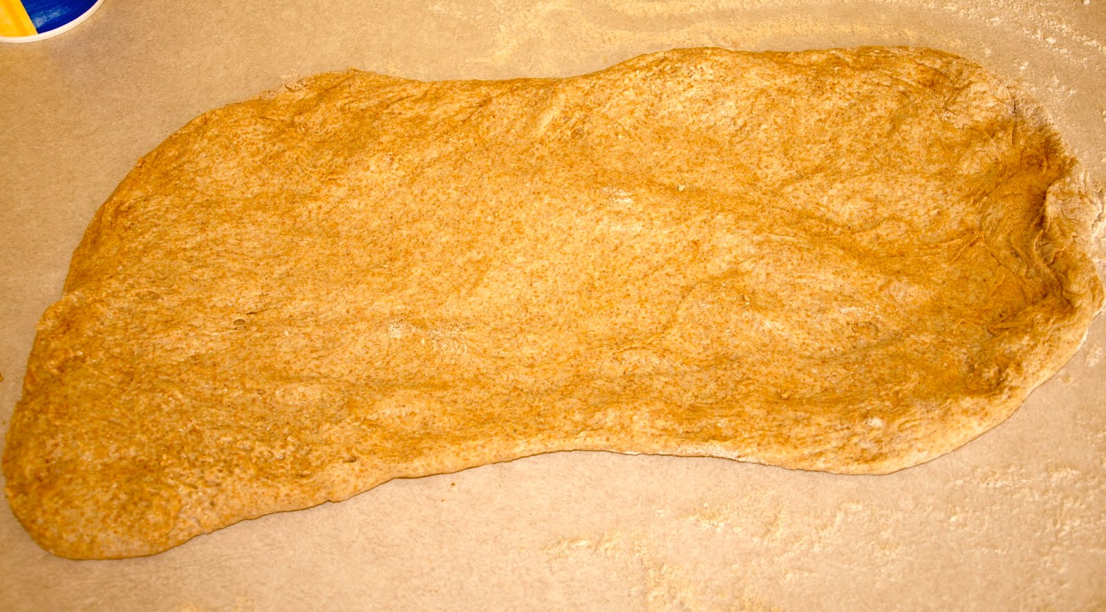 Step 6: Transfer the dough to a floured surface. (Make sure your hands are floured, especially if your dough is as sticky as mine was!) Flatten the dough with your hands, turn it and flour it and work it into a rectangular shape. This was extremely difficult for me because my dough was so sticky and ripped easily. I kept adding more and more flour to my hands and the top of the dough and that did help. I was nervous that I was going to overwork the dough; I had to keep reshaping it because I couldn’t just lift it and turn it over. I finally ended up with this: