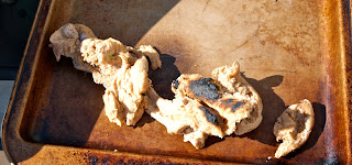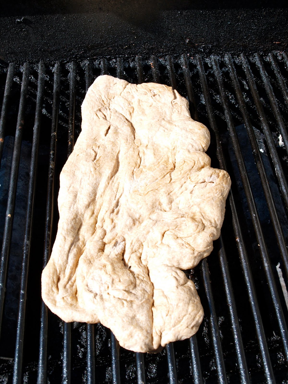 Step 11: Cook the dough until it puffs up and the underside is stiff and marked. This should take about 5 minutes. Flip the dough with tongs and add your toppings. Allow to cook a few more minutes. This part didn’t go well. A part of the dough that had slipped into the grill grates was burned and stuck to the grill. When I tried to turn the dough, it broke off. I was still undeterred and didn’t give up, although many would have thrown in the towel at this point. Here are my broken off pieces of dough: 🙁