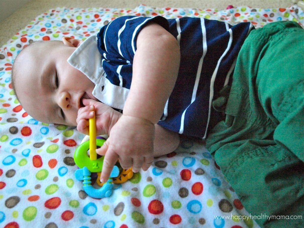 Maybe this will help with the flat spot on the back of his head that is the result of spending so much time on his back. He can’t reach out and grab toys yet, but he’ll hold onto one if I put it in his hand. Speaking of hands…