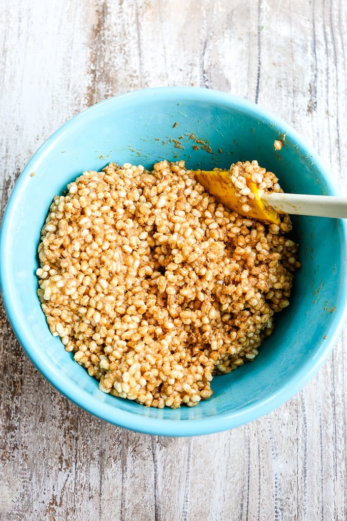 - To a medium bowl, add the crisp rice cereal, almond butter, honey, protein powder, salt, and vanilla. Mix until well combined.