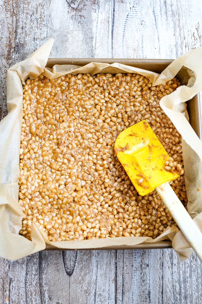 - Line a 8×8 inch baking dish with parchment paper. Firmly press the cereal mixture into the pan. Place in the freezer while you melt the chocolate.