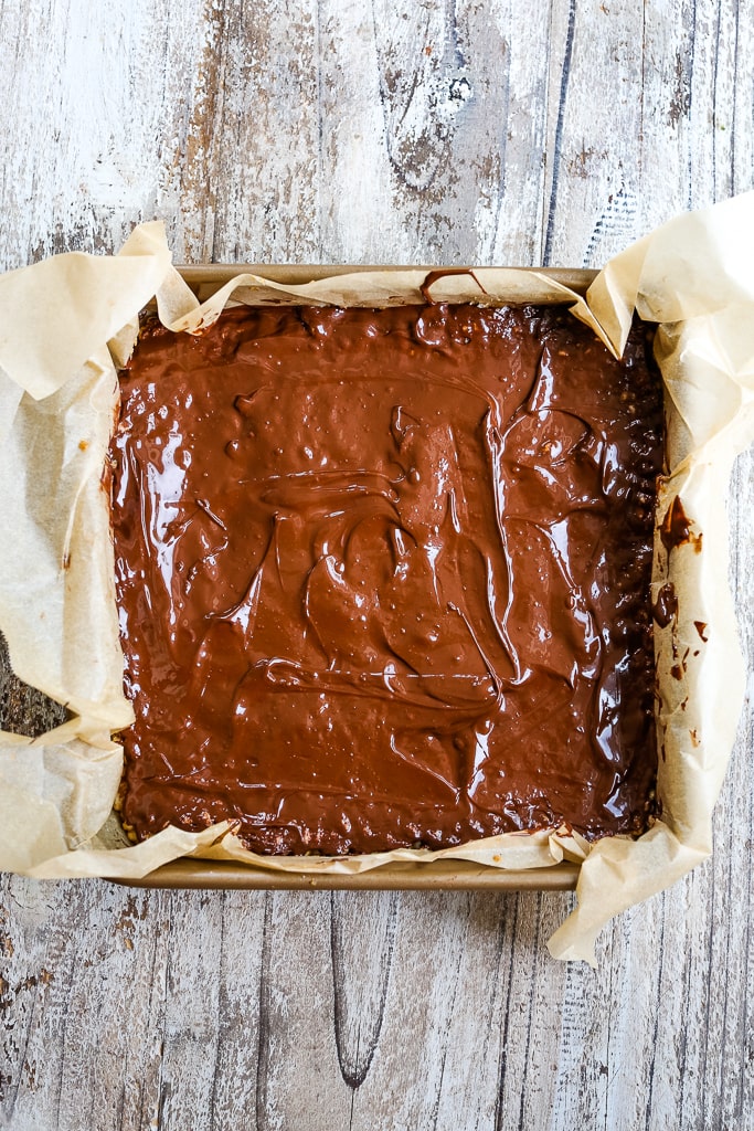 - Pour the chocolate on top of the mixture in the pan and use a rubber spatula to evenly spread it across the pan, making sure it reaches the corners.