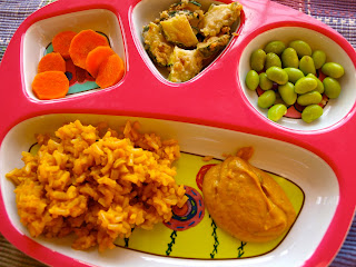 Rice, carrots, edamame, and the sauce separate instead of together. (Is this a toddler thing or just a Meghan thing? She doesn’t ever want her food all mixed together.) I also gave her some leftover zucchini coins. Next time I’ll make sure we eat them all up on the first night because these were not great as leftovers. Her favorite thing was the sauce. She ate it with a spoon as if it was soup. I had to convince her to dip her carrots, edamame, and rice into it.