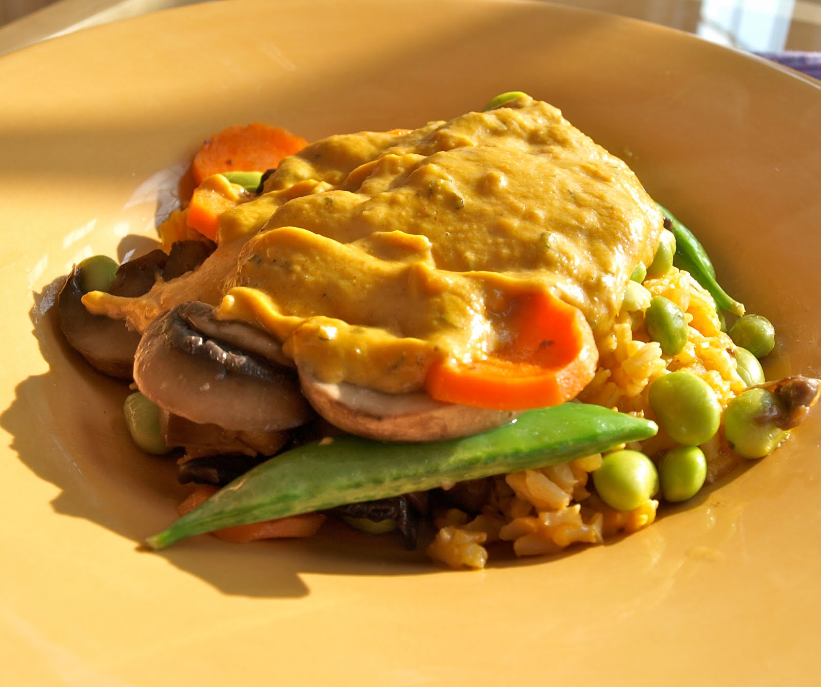 - When the rice is finished cooking, fluff with a fork. Serve with a portion of rice, topped with the vegetables and a drizzle of the sauce.