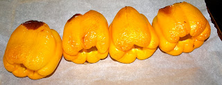 *I didn’t let mine roast long enough AND I forgot to turn them during the cooking time. I’ve roasted peppers before and it’s never been difficult to remove the skins, but this time it was. Make sure they are ready and you remember to turn them! Here are my before and after pics, but remember, they weren’t actually ready. 🙂 - And here they are in the bag: