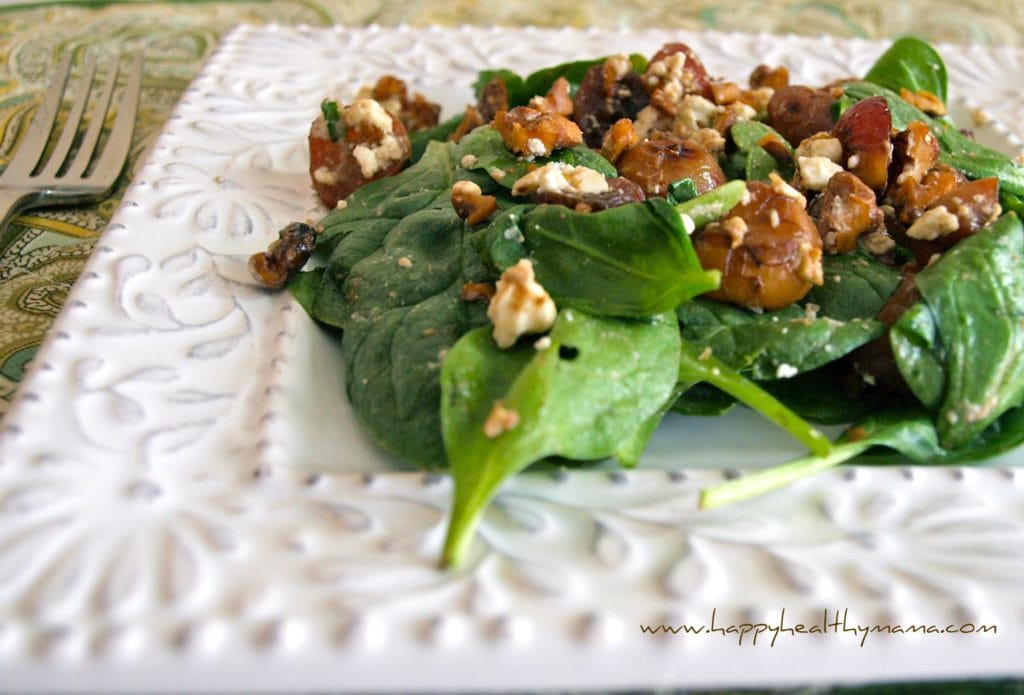 The grapes, tossed first in a little olive oil and balsamic vinegar, become extra sweet and tangy. When the warm grapes are combined with the feta, toasted walnuts, and spinach, the spinach leaves become a little wilted and no extra dressing is needed.