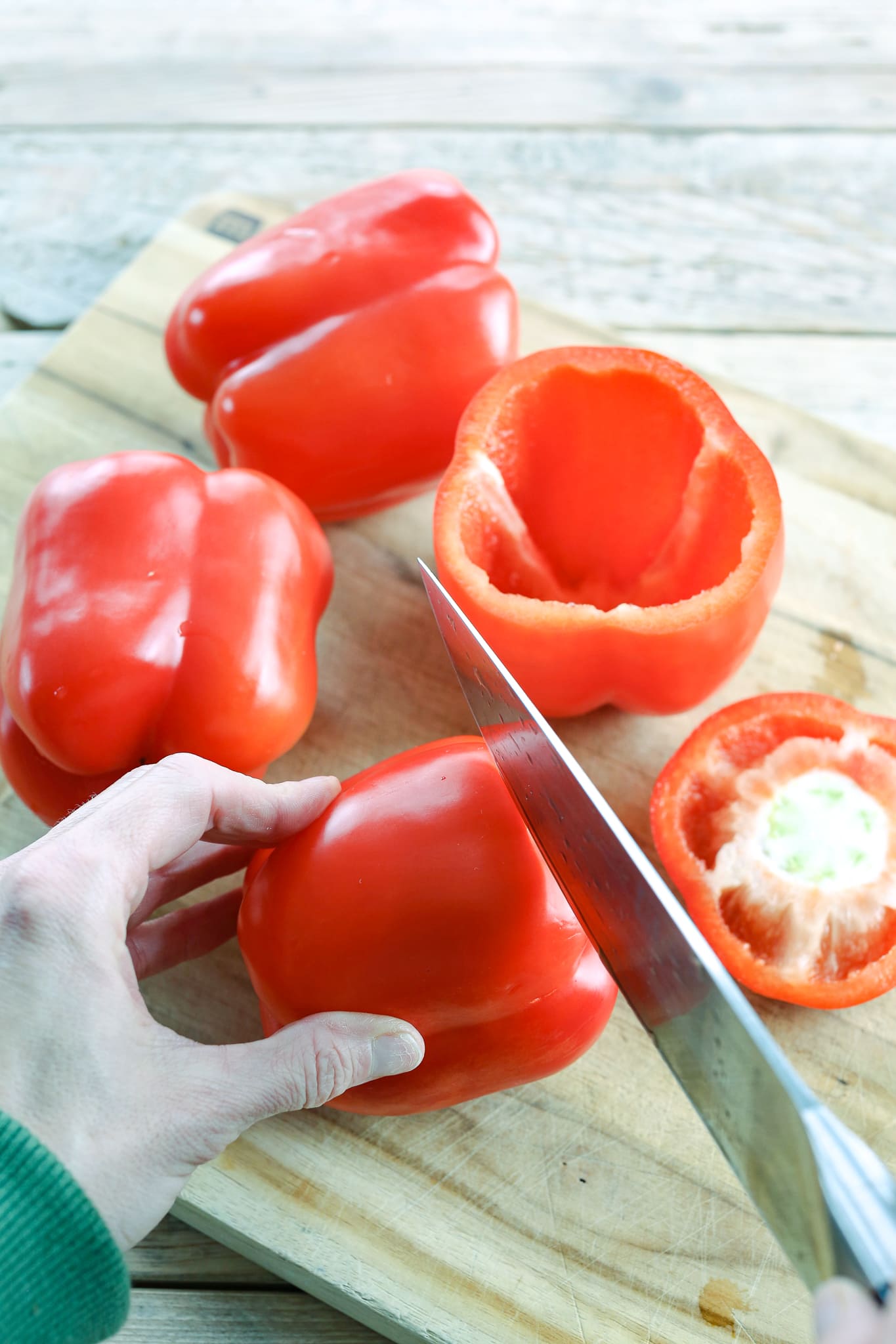Use a sharp knife to remove the top (stem side) of the peppers*. Remove seeds and membranes.