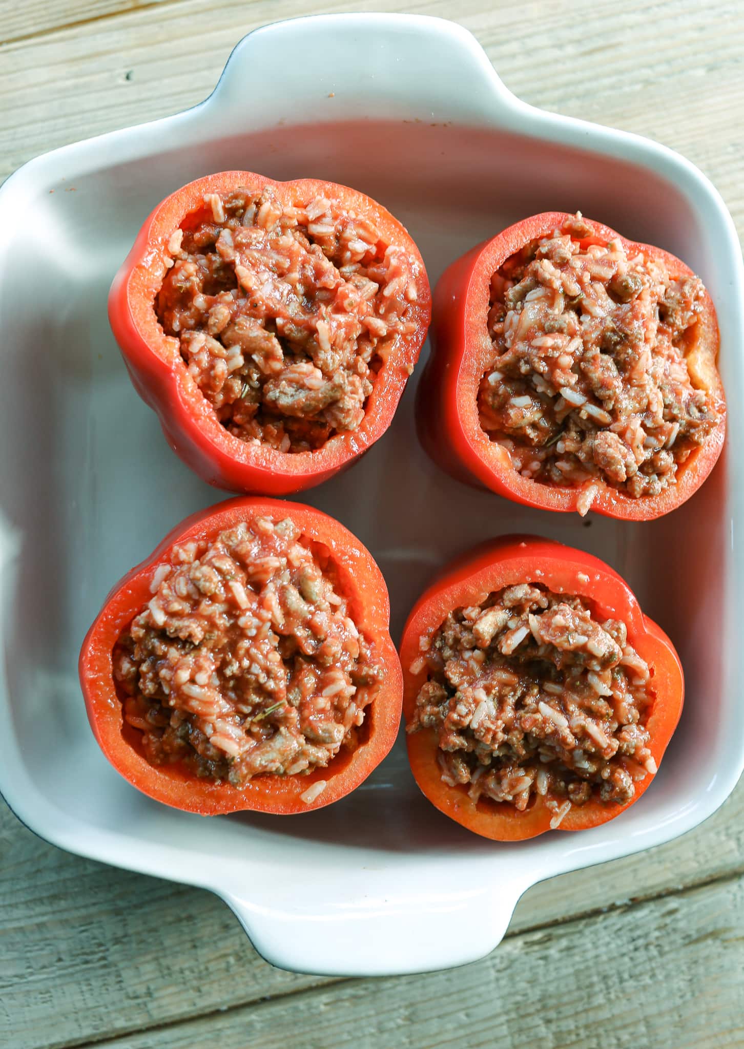 I don’t find parboiling your bell peppers before stuffing them necessary, They tend to get too soft, and don’t hold their shape well. I like a crisp bell pepper for this recipe, and they get plenty soft when you bake them; however, if you like a really soft pepper, feel free to parboil them first.