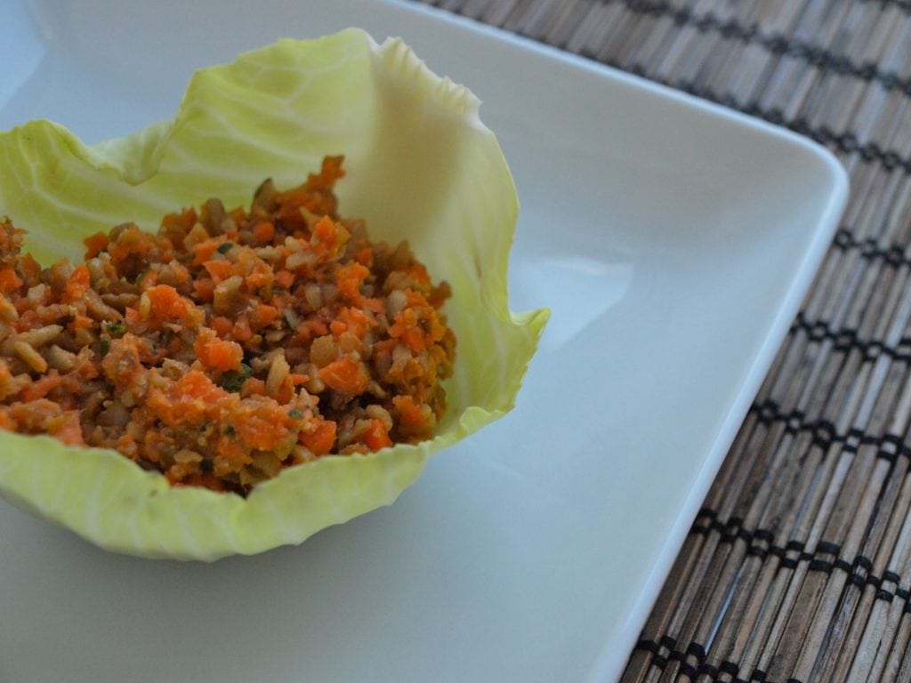 In a food processor, pulse the carrots, celery, pickles, and parsley until they are finely diced. Add the mustard, paprika, lemon juice, and seeds and pulse until the seeds are coarse and crumbly. Taste and add salt and pepper to taste. Place in a bowl and serve with the cabbage leaves or baby romaine hearts. Enjoy!