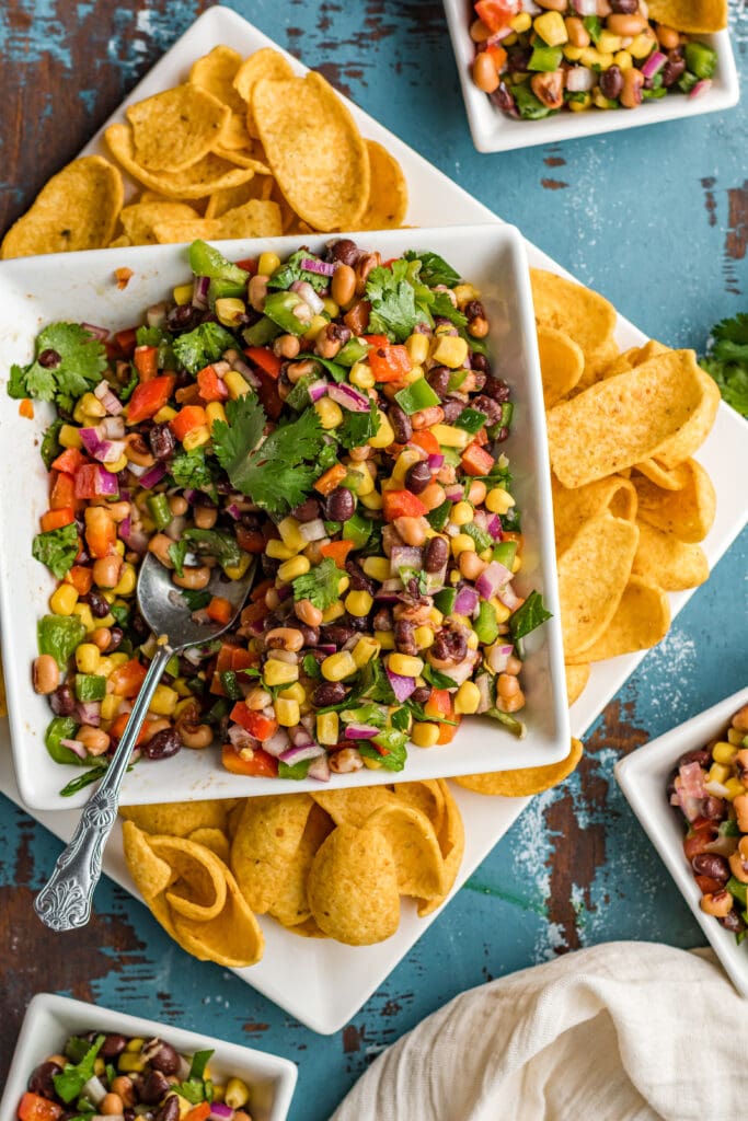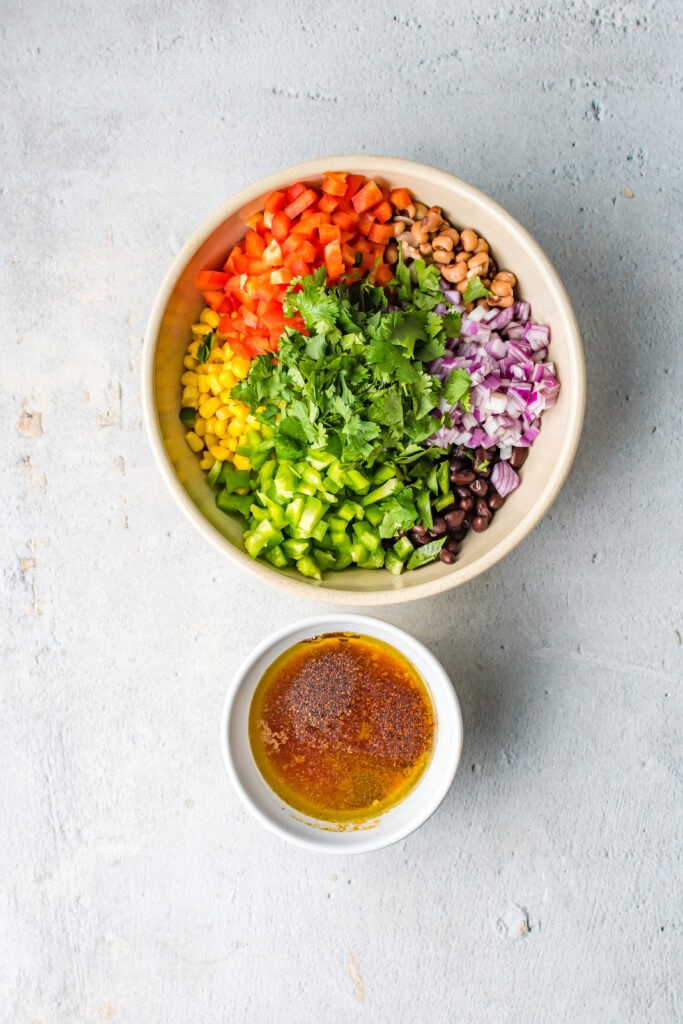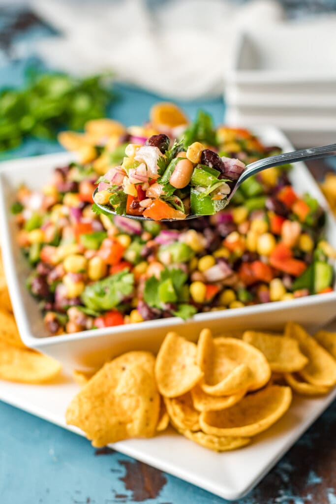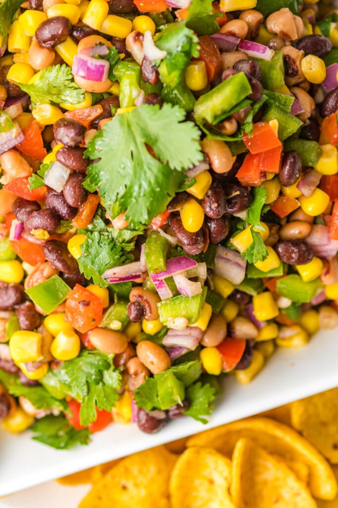 This recipe originated in Texas, made with blackeyed peas, black beans, corn, red and green peppers, onion and dressing. Spice it up with some jalapeno and add some avocado for extra flavor.