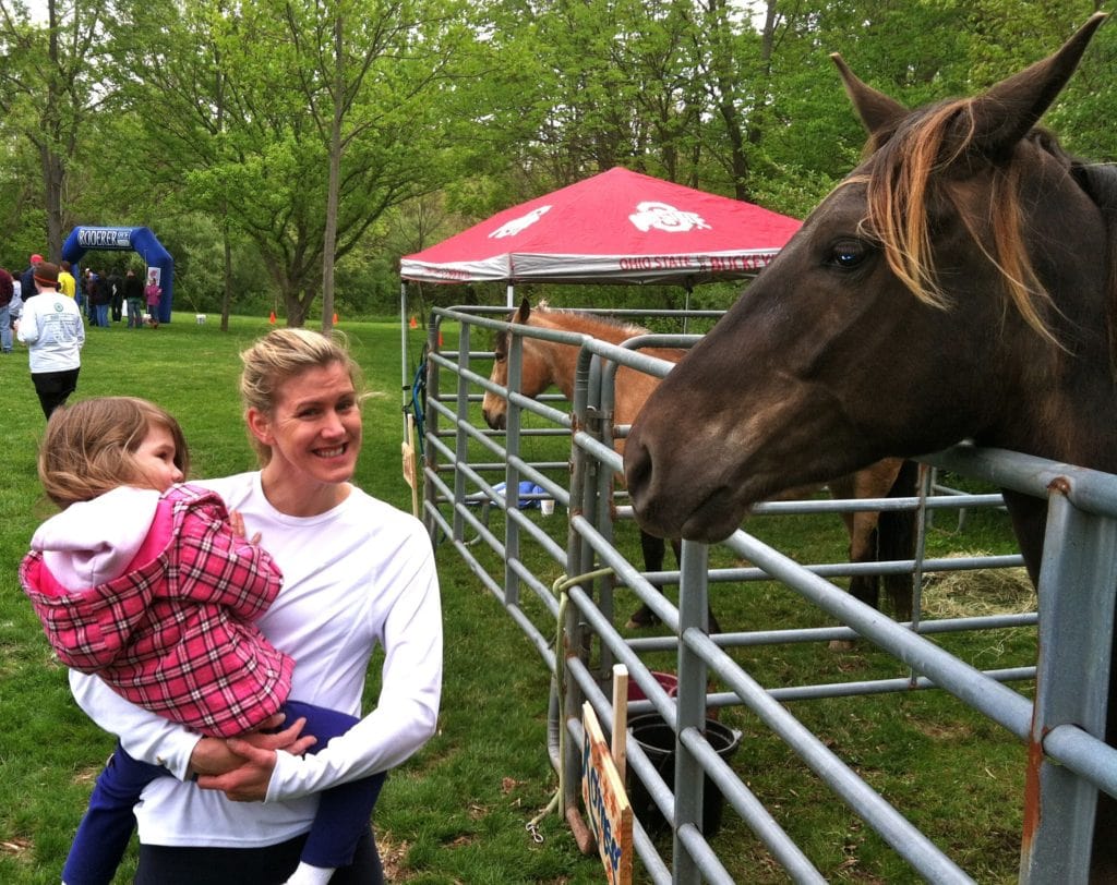 Here’s my only post-race picture. Me showing Meghan the horses (the race was sponsored by a ranch that uses horses as therapy) and giving a big, cheesy smile.