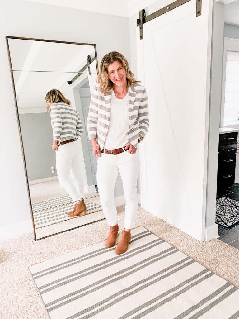 Boom. You just elevated that white tee to a super stylish level. Wear this look and you’re going to achieve that “effortlessly cool” vibe. Do it! I found this blazer at TJ Maxx about 5 years ago and the white jeans are from AG Jeans.