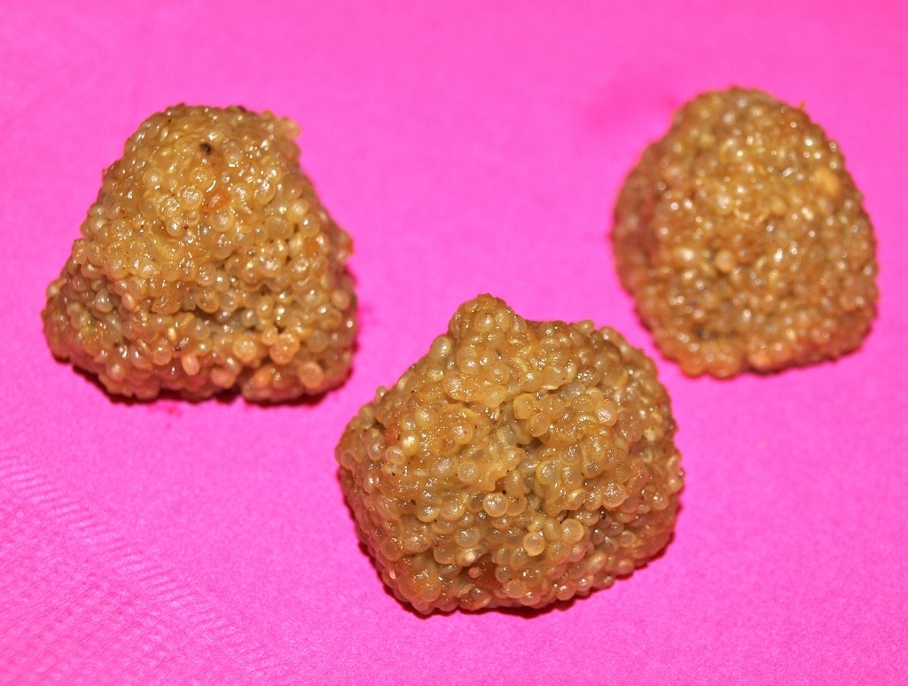 We have been blessed with a child who hasn’t shown any food allergies or intolerances in her two years of life. (Will you please knock on wood for me?) So no, I don’t need to create gluten-free snacks for Meghan because she is allergic. It is important, however, to eat a variety of whole grains and not eat the same ones over and over. I would say the vast majority of Americans who eat whole grains get them from predominately one source: whole wheat. Even if you aren’t allergic, just a slight intolerance to gluten can cause a variety of health problems. So I think it makes sense to try to focus on getting a variety of whole grains into Meghan’s diet. I created these balls in an attempt to mix it up a bit. She often eats oatmeal for breakfast, so when I went to make her usual oat-based snack balls, I thought: why not quinoa? The result was this fun little snack ball that tastes fantastic and provides a great protein punch.