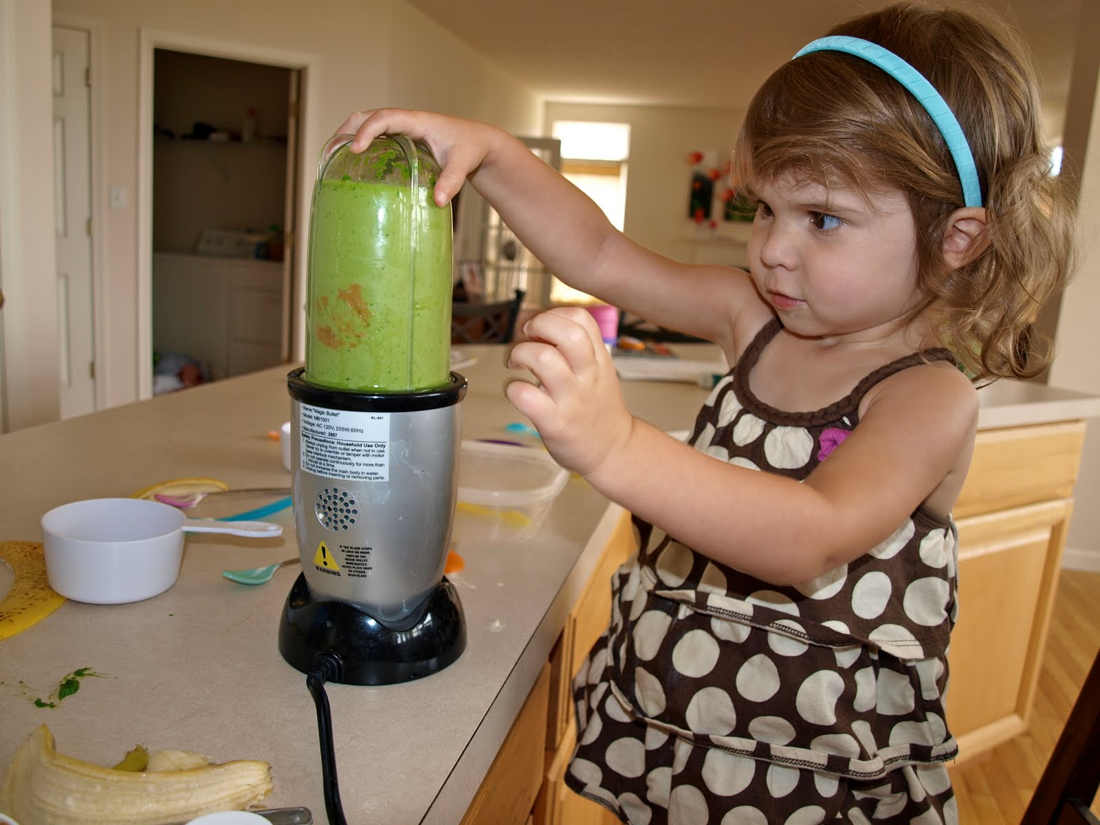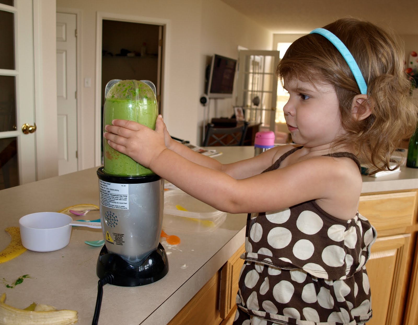 That got me thinking. Why did I just assume she wouldn’t like kale? Because I wouldn’t have touched it before the age of 25? Maybe I would have liked it, too, if someone would have offered it to me at a young age. So I decided to go ahead and take the kale plunge. I added it to her beloved smoothie repertoire. I mixed it in with her favorite combo of banana+peanut butter. I have tried it twice so far. The first time, she drank the entire smoothie and asked for more. The second time, I got really ambitious. I added more kale. I filled up the entire Magic Bullet cup.