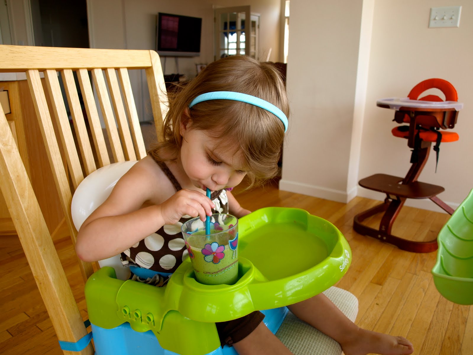 With double the amount of kale, Meghan still liked it. She drank almost her whole smoothie, but I could tell it wasn’t her favorite. She didn’t ask for more. I’ll probably stick with the smaller amount of kale in the future. Here’s the original recipe (approximations, I didn’t measure):